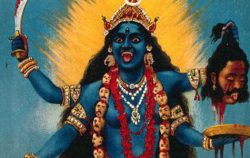 Kali trampling Shiva. Chromolithograph by R. Varma.
